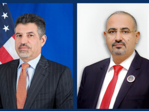 بحث الرئيس عيدروس الزُبيدي، رئيس المجلس الانتقالي الجنوبي، نائب رئيس مجلس القيادة الرئاسي، في لقائه السفير الأمريكي، ستيفن، أهمية وحدة مجلس القيادة الرئاسي.