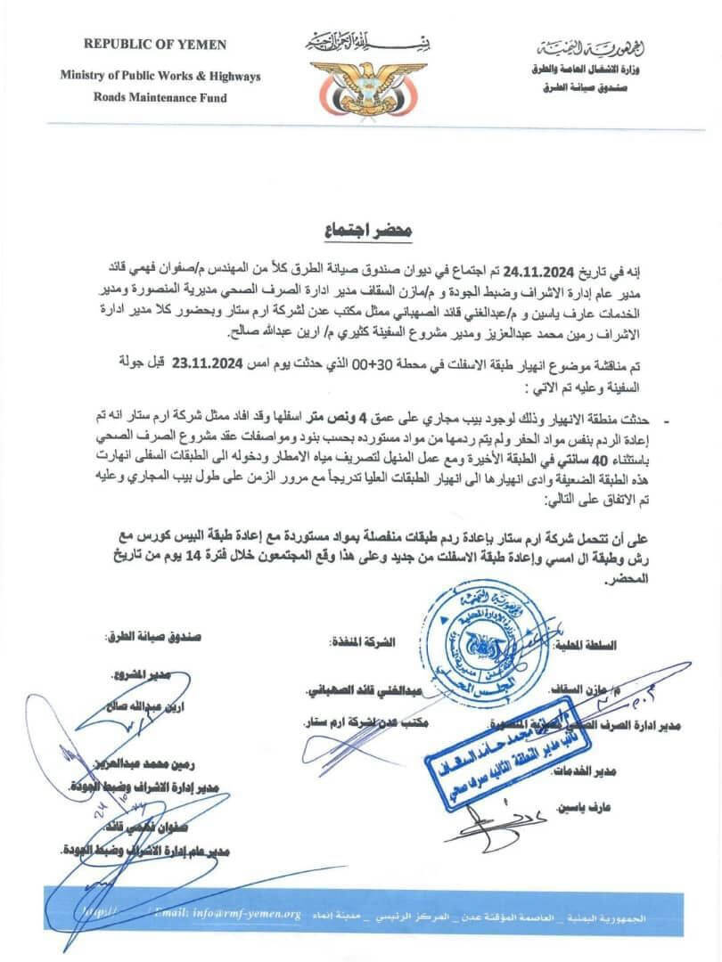 وأشار أيضًا إلى أن دخول مياه الأمطار إلى الطبقة السفلى أدى إلى انهيارها، مما تسبب في انهيار الطبقات العليا تدريجيًا على طول أنبوب الصرف الصحي. وأقر بأن الشركة ستتحمل مسؤولية إعادة ردم الطبقات المنفصلة بمواد مستوردة، مع إعادة طبقة “البيس كورس” وطبقة الأسفلت من جديد خلال 14 يومًا من تاريخ الاجتماع.