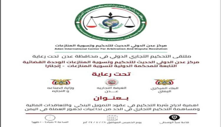 ويهدف مركز عدن للتحكيم الدولي من إقامة هذا المتلقى، الذي سيكون بعنوان (أهمية إدراج شرط التحكيم في عقود التمويل البنكي والتعاقدات المالية ومساهمة التحكيم التجاري في الحد من تداعيات تدهور العملة في بلادنا)، إلى المساهمة في الحد من تدهور القيمة الشرائية للعملة المحلية (الريال اليمني) أمام العملات الأجنبية، إدراكاً منه أن التحكيم التجاري يسهم بشكل كبير في حل بعض تداعيات أزمة تدهور العملة في اليمن.
