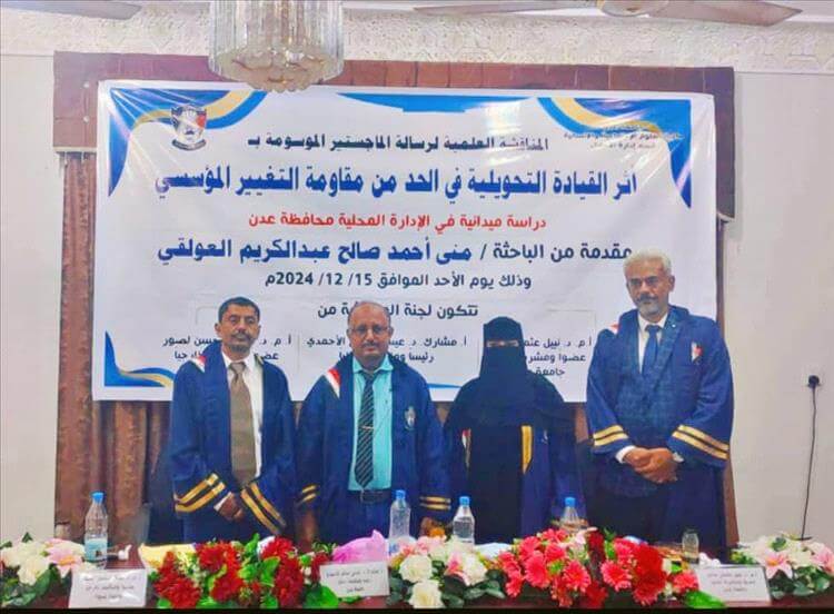 حيت قدمت الباحثة اطروحتها الموسومة بعنوان ( أثر القيادة التحويلية في الحد من مقاومة التغيير المؤسسي ) دراسة ميدانية على عينه من قيادات مكاتب السلطة المحلية بالعاصمة عدن.