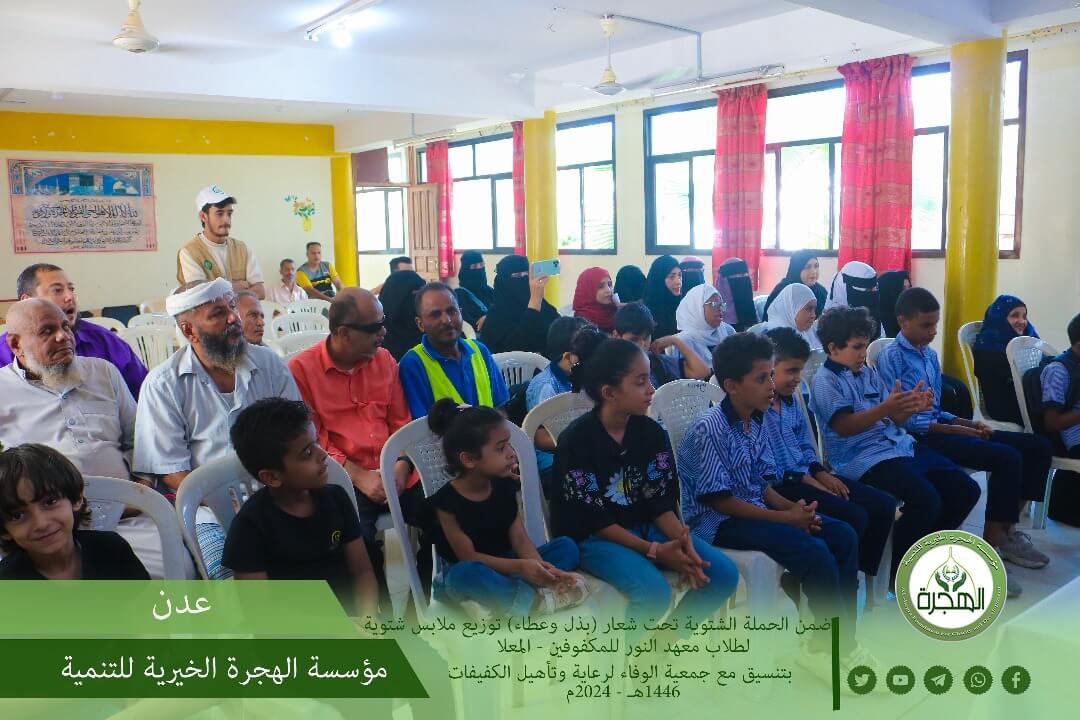 بالتنسيق مع جمعية الوفاء لرعاية وتأهيل الكفيفات ، قامت مؤسسة الهجرة الخيرية للتنمية بالعاصمة عدن ، يوم الاثنين الموافق 16 ديسمبر 2024 م بتوزيع ملابس شتوية لطلاب معهد النور للمكفوفين بمديرية المعلا .