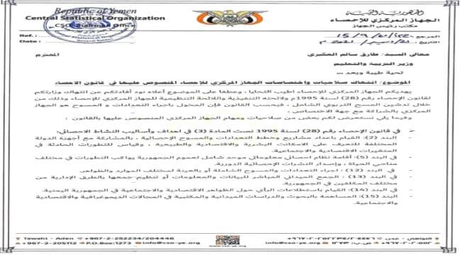كشفت وثيقة رسمية للجهاز المركزي للاحصاء بالعاصمة عدن موجهة الى وزير التربية والتعليم عن إنتهاك صلاحيات واختصاصات الجهاز المركزي للاحصاء المنصوص عليها في القانون رقم 28 للاحصاء.