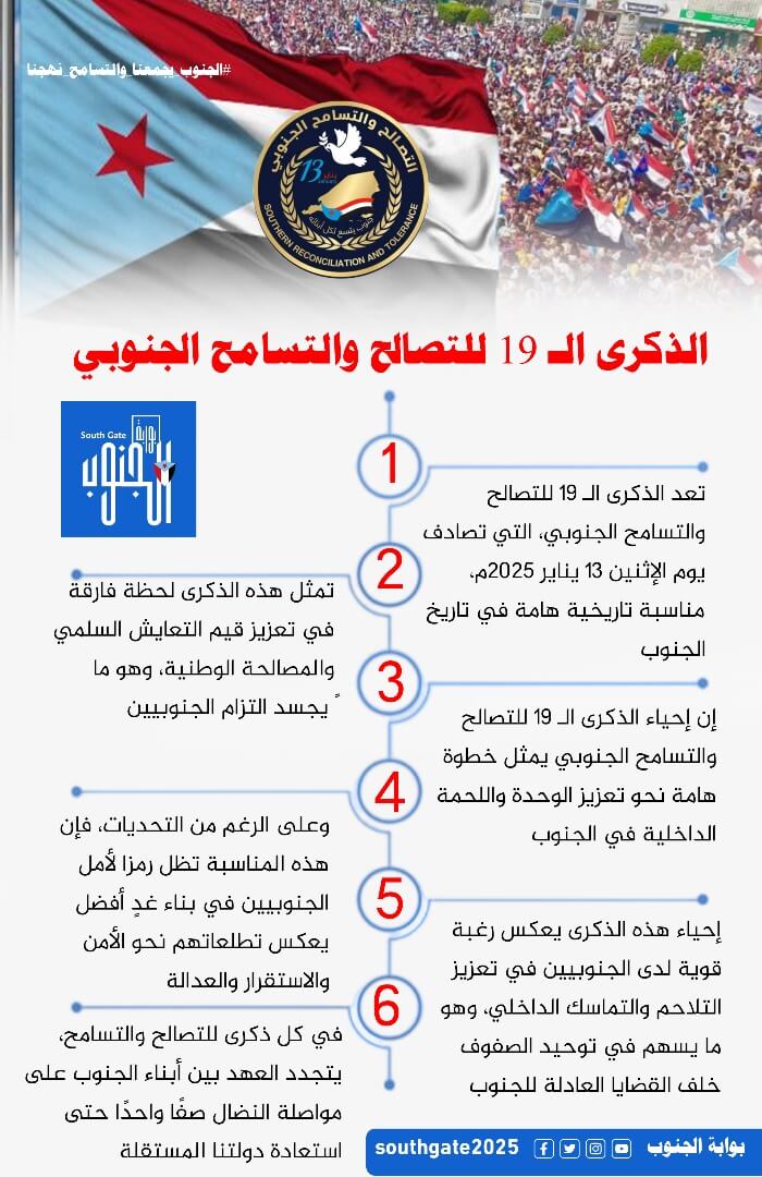 ودعوا إلى أهمية إحياء الذكرى الـ (19) للتصالح والتسامح الجنوبي، والذي تُصادف يوم غد الإثنين 13 يناير 2025م.