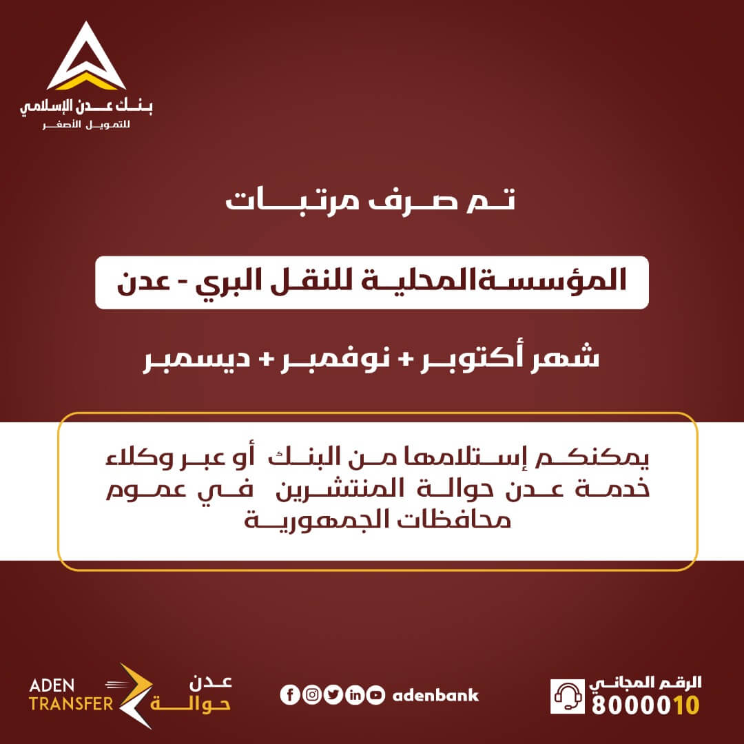 أعلن بنك عدن الإسلامي للتمويل الاصغر اليوم عن بدء عملية صرف مرتبات المؤسسة المحلية للنقل البري بالعاصمة عدن لشهر اكتوبر ونوفمبر وديسمبر.