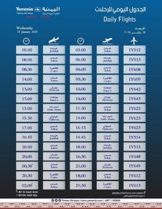 تغادر 15 رحلة طيران، للخطوط الجوية اليمنية، غدا الأربعاء، على النحو التالي: