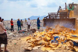 وجرت عملية إتلاف قرابة (319) كرتونًا، يزن كل منها (25) كيلوجرام، من نكهة الجبنة (مواد خام) التي تدخل في صناعة البفك، وغيرها، كانت تحمل بلد المنشأ جمهورية مصر العربية، وذلك بحضور مندوبيّ الهيئة العامة للمواصفات والمقاييس، وعمليات العاصمة عدن، ونيابة الصناعة والتجارة بعدن، ومكتب الصناعة والتجارة، والصحة والبيئة في مكتب الاشغال،وذلك بعد تأكيد انتهاء صلاحية المنتج، وفق تقرير هيئة المواصفات وضبط الجودة.