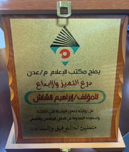 وكرمت الكازمي، الأستاذ إبراهيم الشاش، أحد موظفيّ (مكتب إعلام العاصمة عدن)، بدرع (التميز والإبداع)، عن روايته الموسومة بـ (عدن.. المدينة التي كانت)، وذلك لما احتوته الرواية من سرد قصصي بديع، إلى جانب جهوده المبذولة في الحقل الإعلامي، والثقافي، والإمكانيات التي يتمتع بها.