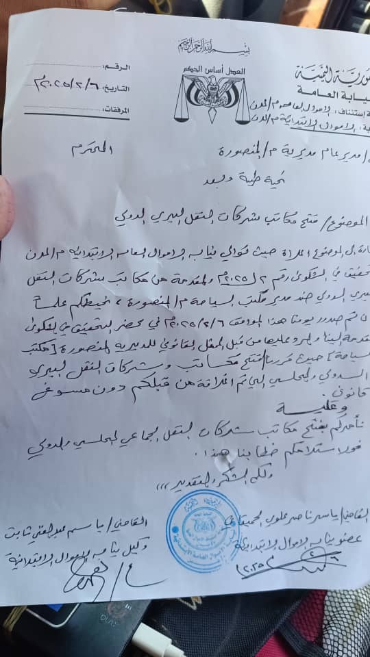 أصدرت نيابة الأموال العامة الابتدائية بعدن، اليوم الخميس، قرارًا يقضي بإعادة فتح مكاتب شركات النقل البري الدولي التي تم إغلاقها سابقًا في مديرية المنصورة دون مسوغات قانونية.