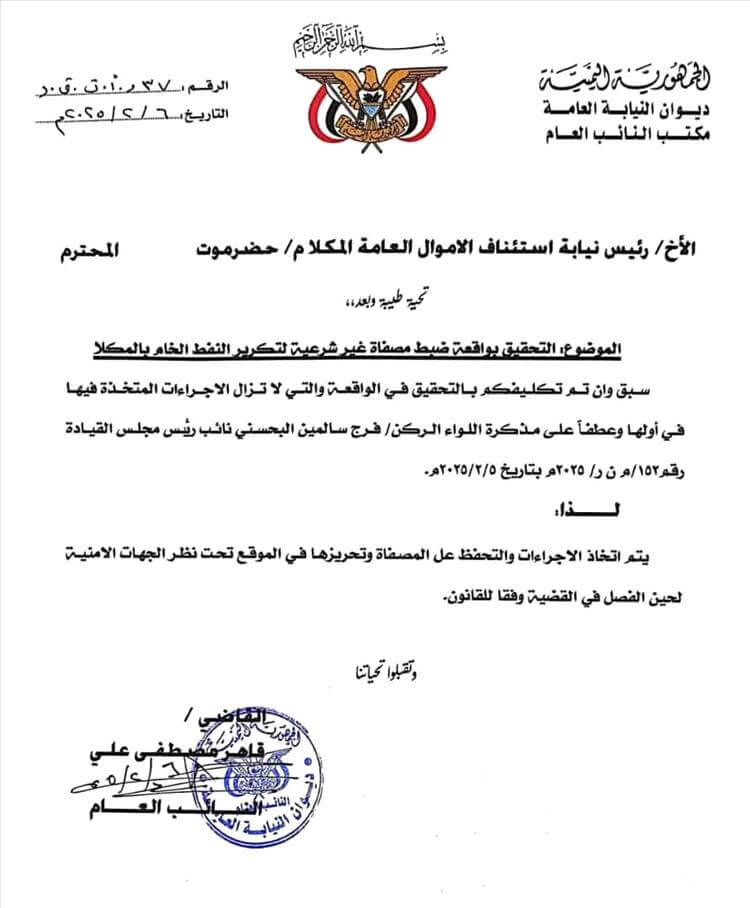 ولفت النائب العام في التوجيه إلى أنه سبق وتكليف نيابة الاستئناف في المكلا بالتحقيق في الواقعة التي لا تزال في أولها، وبناء على مذكرة البحسني، فقد قضى التوجيه بالتحفظ على المصفاة وتحريزها في الموقع تحت نظر الجهات الأمنية لحين الفصل في القضية وفق القانون.