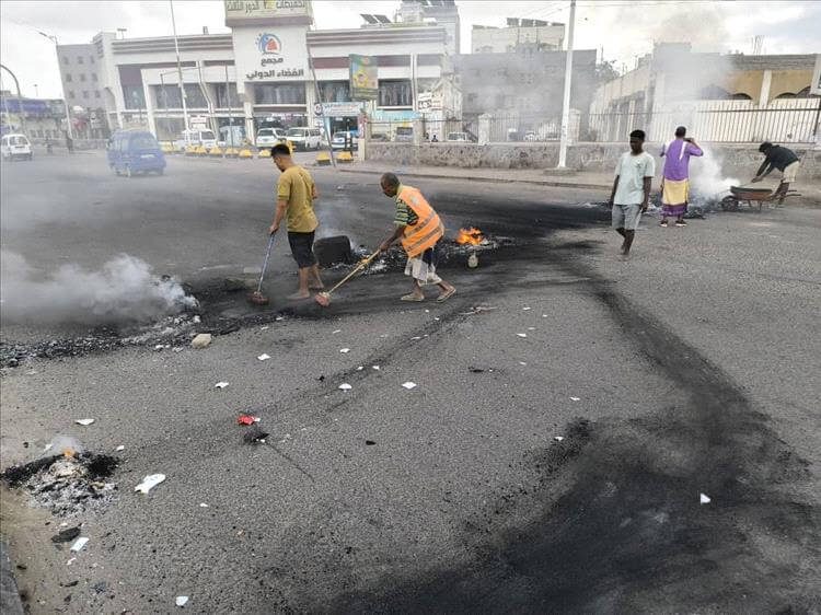 حيث تقوم آليات وفرق عمال النظافة وتحسين العاصمة عدن بحملات رفع َمخلفات اطارات السيارات المحروقة وأعمال كنس وبرش وتصفية الشوارع والطرق الرئيسية والفرعية في العاصمة عدن وفتح الشوارع المغلقة جراء الغضب الشعبي جراء الانقطاع الكامل لخدمة الكهرباء مخلفة تشوية المضهر الحضاري لمدينة عدن وعرقلة أعمال النظافة وتبديد جهود العمال.
