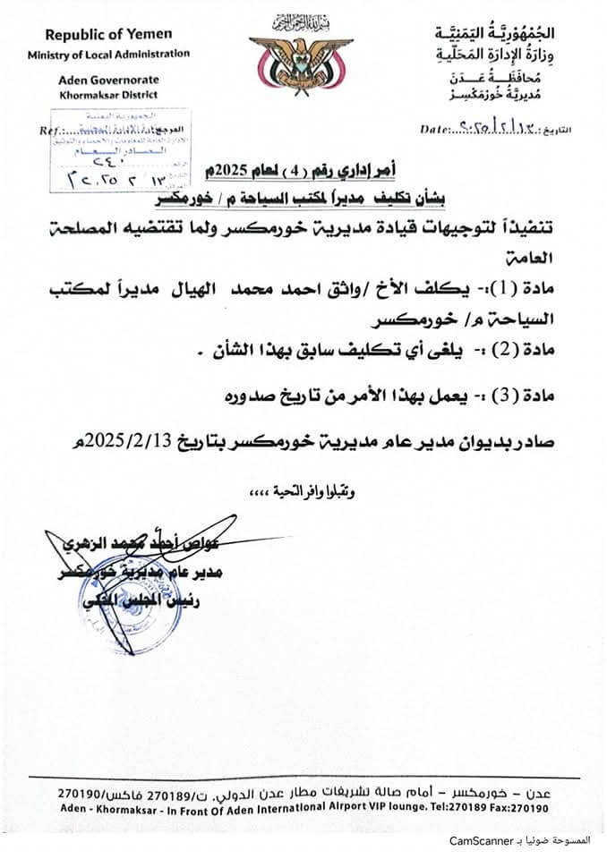 حيث أصدر مدير عام خورمكسر قراراً بتكليف واثق أحمد محمد الهيال مديراً لمكتب السياحة بالمديرية .