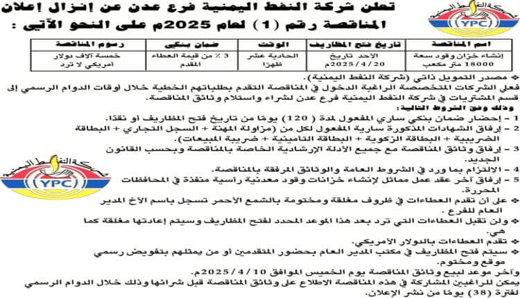 وأوضحت الشركة أن المناقصة مفتوحة أمام الشركات المتخصصة الراغبة في التقدم بعروضها، مع ضرورة تقديم طلبات خطية خلال أوقات الدوام الرسمي إلى قسم المشتريات في شركة النفط اليمنية – فرع عدن، وذلك لشراء واستلام وثائق المناقصة.