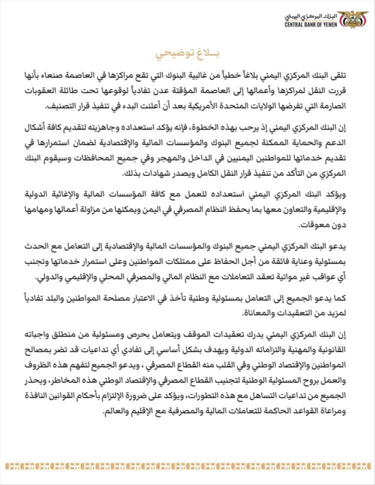 إن البنك المركزي اليمني إذ يرحب بهذه الخطوة، فإنه يؤكد استعداده وجاهزيته لتقديم كافة أشكال الدعم والحماية الممكنة لجميع البنوك والمؤسسات المالية والإقتصادية لضمان استمرارها في تقديم خدماتها للمواطنين اليمنيين في الداخل والمهجر وفي جميع المحافظات وسيقوم البنك المركزي من التأكد من تنفيذ قرار النقل الكامل ويصدر شهادات بذلك.