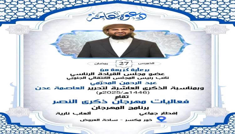 دعت اللجنة التحضيرية لمهرجان ذكرى النصر، جميع أبناء العاصمة عدن والمحافظات المجاورة للمشاركة في فعاليات المهرجان وحضور الإفطار الجماعي المقرر إقامته يوم الخميس المقبل “27 رمضان” في ساحة العروض بخور مكسر، برعاية كريمة من القائد عبدالرحمن المحرّمي عضو مجلس القيادة الرئاسي نائب رئيس المجلس الانتقالي الجنوبي القائد العام لألوية العمالقة الجنوبية.
