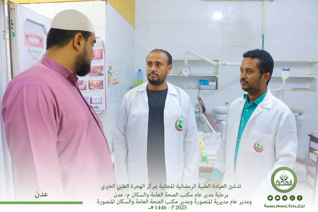 برعاية من مدير عام مكتب الصحة العامة والسكان بالعاصمة عدن الأستاذ الدكتور أحمد مثنى البيشي ، ورئيس المجلس المحلي ومدير عام مديرية المنصورة الأستاذ أحمد علي الداؤودي ، ومدير مكتب الصحة بمديرية المنصورة الدكتور عبدالحكيم المفلحي ، وضمن أعمال الحملة الرمضانية الحادية عشر (رمضان عطاء وإحسان) لمؤسسة الهجرة الخيرية للتنمية بعدن دشن مركز الهجرة الطبي الخيري ، يوم السبت الموافق 22 مارس 2025م المخيم الطبي الخيري الرمضاني المجاني بحضور البيشي ، ومدير الصحة بمديرية المنصورة الدكتور عبدالحكيم المفلحي ، ورئيس اللجان المجتمعية الأستاذ جهاد معتوق ، ورئيس حي أبو اليمامة الأستاذ قائد المفلحي ، ومدير أربطة التربية الإسلامية السيد أبي بكر بن أحمد الهدار ، ورئيس مؤسسة الهجرة الخيرية للتنمية السيد عبدالرحمن المحضار ، والعديد من الشخصيات الإجتماعية ، حيث تم تدشين المخيم الطبي الخيري الرمضاني لعلاج الأمراض المزمنة (ضغط – سكر – كوليسترول – أمراض القلب – أمراض الأطفال) داخل المركز ولمدة ثلاثة أيام متوالية ابتداء من يوم السبت ٢٢ إلى ٢٤ رمضان ١٤٤٦هـ الموافق 22 إلى 24 مارس 2025م ، من الساعة التاسعة مساءً إلى الثانية عشر والنصف بعد منتصف الليل ، وكان الإقبال كبير على المركز حيث استفاد من المخيم في اليوم الأول قرابة 100 مريضاً من الرجال والنساء والأطفال ، وذلك بدخول المرضى للدكاترة بالمركز للمعاينة وعمل جميع الفحوصات الطبية وأخذ الأدوية الصيدلانية مجاناً.