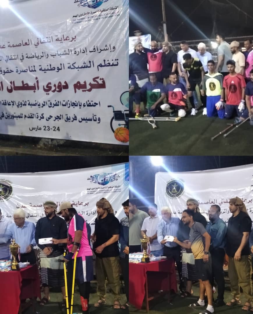 نظمة شبكة مناصرة حقوق دوي الهمم أمسية رمضانيه بتكريم دوري ابطال الإراده إحتفاء بإنجازات الفرق الرياضيه لدوي الاعاقة الحركية وتأسيس فريق الحركة الجرحئ لكرة القدم للمبتورين في العاصمة عدن .
