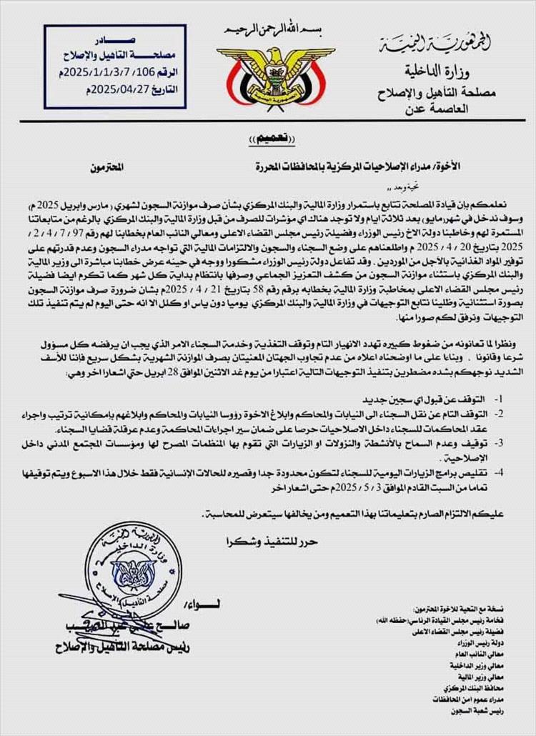 وحذّر التعميم، الممهور بتوقيع اللواء صالح علي عبدالحبيب، رئيس مصلحة التأهيل والإصلاح، من استمرار عدم صرف المخصصات المالية الخاصة بالسجون، مشيرًا إلى أن الوضع المالي الحالي بات يهدد العمل الإداري والأمني داخل السجون بشكل خطير.