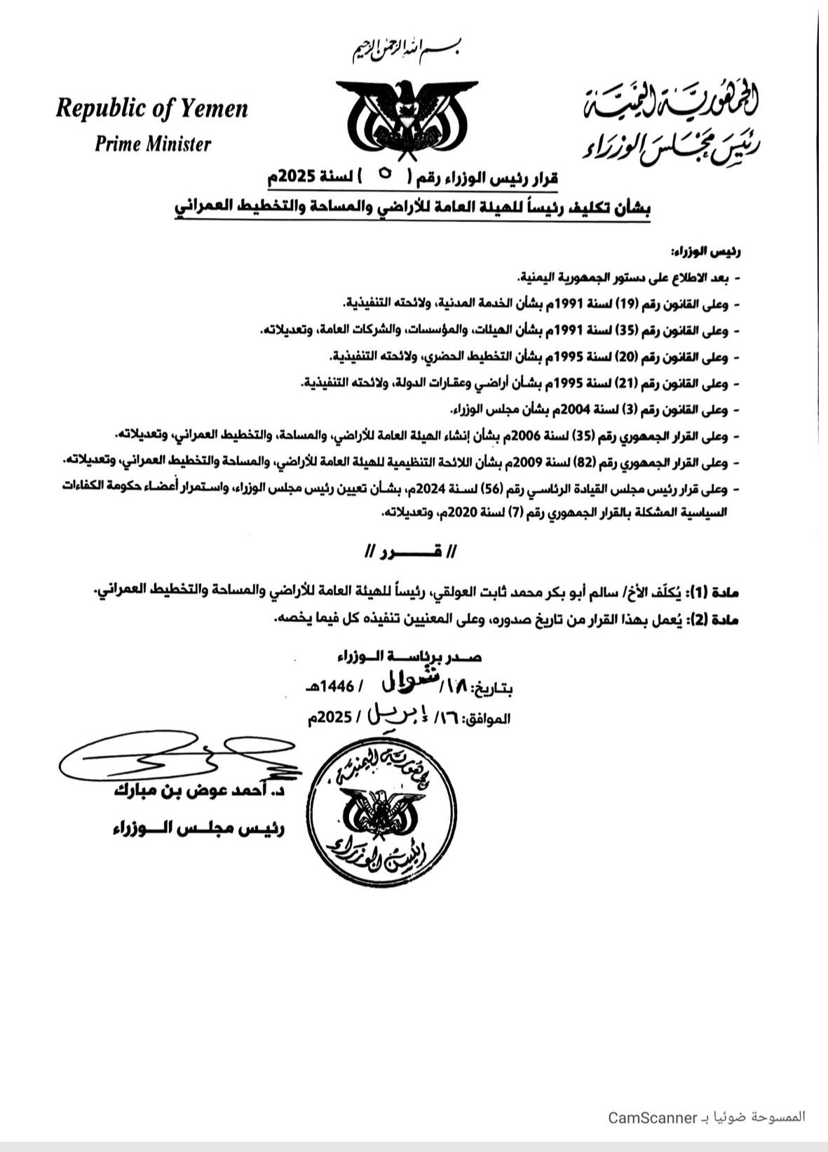 Homeأخبار عاجل: تكليف سالم ثابت العولقي رئيساً للهيئة العامة للأراضي وعقارات الدولة (وثيقة) 30 أبريل 2025 - 15:00 العاصمة عدن” مكتب الإعلام” خاص: عاجل: تكليف سالم ثابت العولقي رئيساً للهيئة العامة للأراضي وعقارات الدولة (وثيقة)