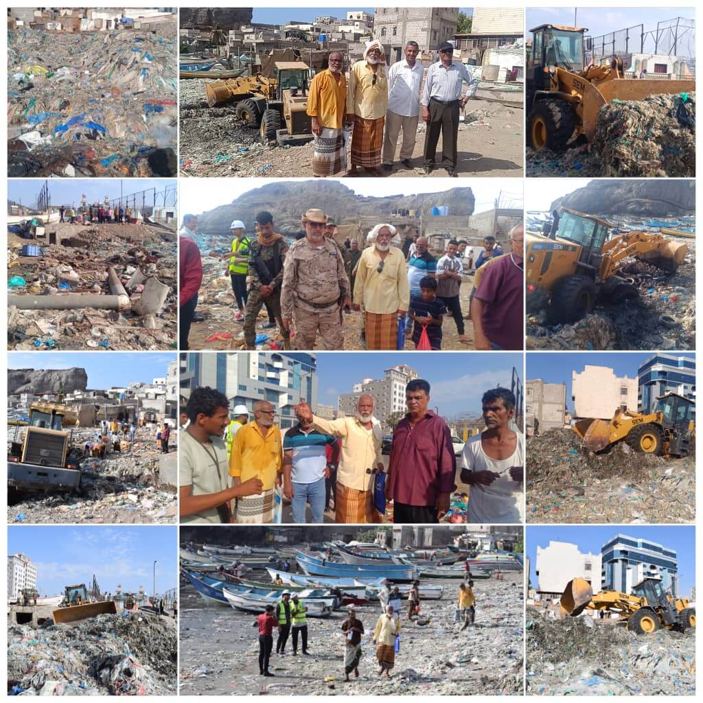 حملة لرفع المخلفات من مرسى قوارب الصيادين بصيرة في العاصمة عدن