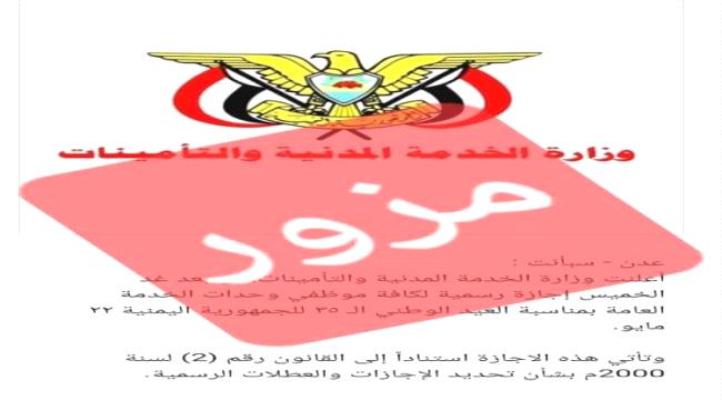 نفى مصدر مسؤول في وزارة الخدمة المدنية والتأمينات – عدن صحة ما تم تداوله عبر بعض الوسائل الإعلامية، بما فيها ما نُشر في وكالة الأنباء اليمنية (سبأ)، بشأن إعلان يوم الخميس الموافق 22 مايو 2025 إجازة رسمية بمناسبة ما سمي بـ”العيد الوطني الـ35 للجمهورية اليمنية”.