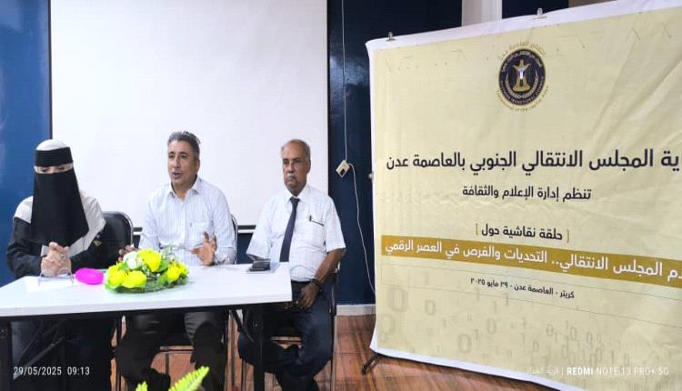 برعاية المجلس الانتقالي الجنوبي، نظّمت إدارة الإعلام والثقافة في العاصمة عدن، ندوة نقاشية بعنوان: “المجلس الانتقالي.. التحديات والفرص في العصر الرقمي”، بحضور نخبة من الإعلاميين والصحفيين الجنوبيين وطلاب كلية الإعلام، وأدار الجلسة الإعلامي خالد ناصر شوبة.