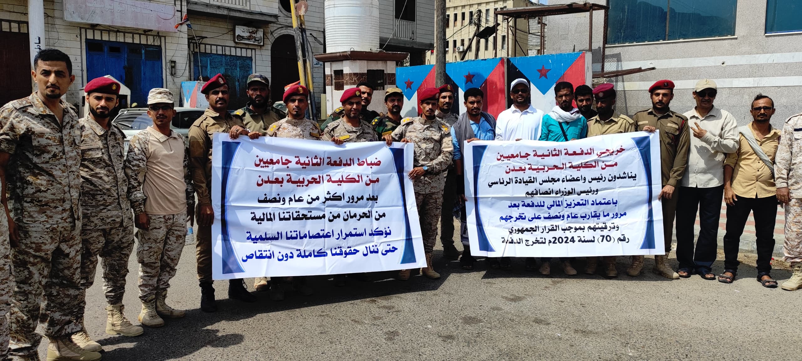 نفّذ ضباط الدفعة الثانية من خريجي الكلية الحربية في عدن، صباح اليوم، وقفتهم الاحتجاجية الثانية أمام مقر الحكومة اليمنية، للمطالبة باعتماد مبلغ التعزيز المالي الخاص برواتبهم المتوقفة منذ أكثر من عام ونصف، عقب تخرجهم من الكلية.