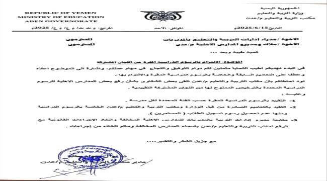 أصدرت إدارة التربية والتعليم في العاصمة عدن تعميمًا رسميًا موجّهًا لمُلّاك المدارس الأهلية، شددت فيه على ضرورة الالتزام بالرسوم الدراسية المُحددة لكل فئة دراسية، وعدم فرض أي زيادات غير معتمدة.