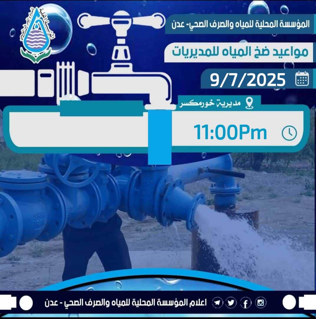 في إطار جهودها المستمرة لتلبية احتياجات المواطنين، أعلنت المؤسسة المحلية للمياه والصرف الصحي بالعاصمة عدن عن موعد بدء ضخ المياه لأحياء مديرية خورمكسر، وذلك مساء اليوم الأربعاء 9 يوليو 2025 عند الساعة 11:00 ليلاً.