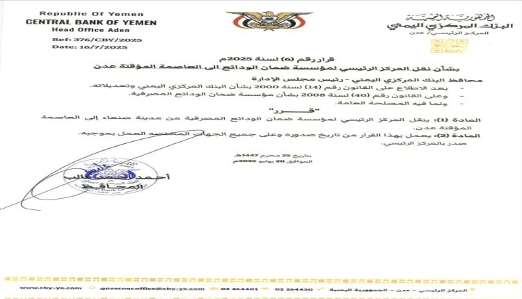 خطورة نقل مؤسسة ضمان الودائع إلى مركزي عدن