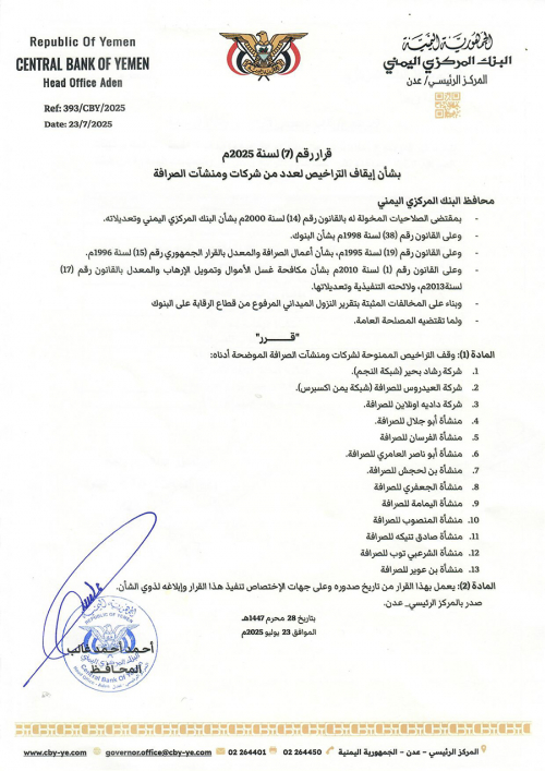 أصدر محافظ البنك المركزي أ. أحمد أحمد غالب قرار رقم (7) لعام 2025م، بشأن ايقاف تراخيص عدداً من شركات ومنشات الصرافة المخالفة والمثبتة بتقرير النزول الميداني المرفوع من قطاع الرقابة على البنوك.