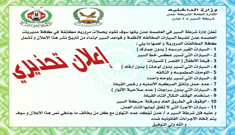 وعليه فإن شرطة السير م / عدن تؤكد عدم التهاون مع كل من يخالف ما جاء في نص هذا الإعلان و سوف يتم إتخاذ الإجراءات القانونية ضده.