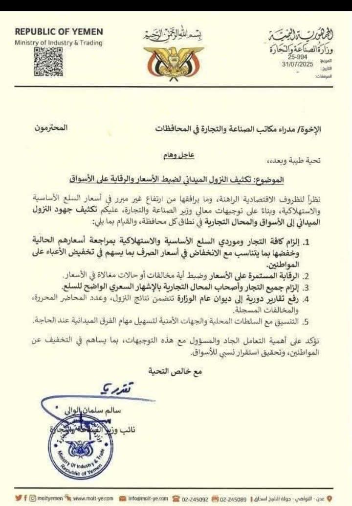 وجه رئيس مجلس الوزراء سالم صالح بن بريك وزارة الصناعة والتجارة بالتنسيق مع الوزارات المختصة والسلطات المحلية في عدن والمحافظات المحررة، بتشكيل فرق ميدانية وتنفيذ حملات رقابة وتفتيش لضبط أسعار السلع والمواد التموينية، بما يتناسب مع التحسن الكبير في سعر صرف العملة الوطنية.