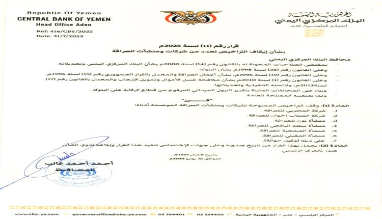 أصدر محافظ البنك المركزي أ. أحمد أحمد غالب قرار رقم (11) لعام 2025م، بشأن ايقاف التراخيص الممنوحة لعددٍ من شركات ومنشآت الصرافة المخالفة والمثبتة بتقرير النزول الميداني المرفوع من قطاع الرقابة على البنوك.