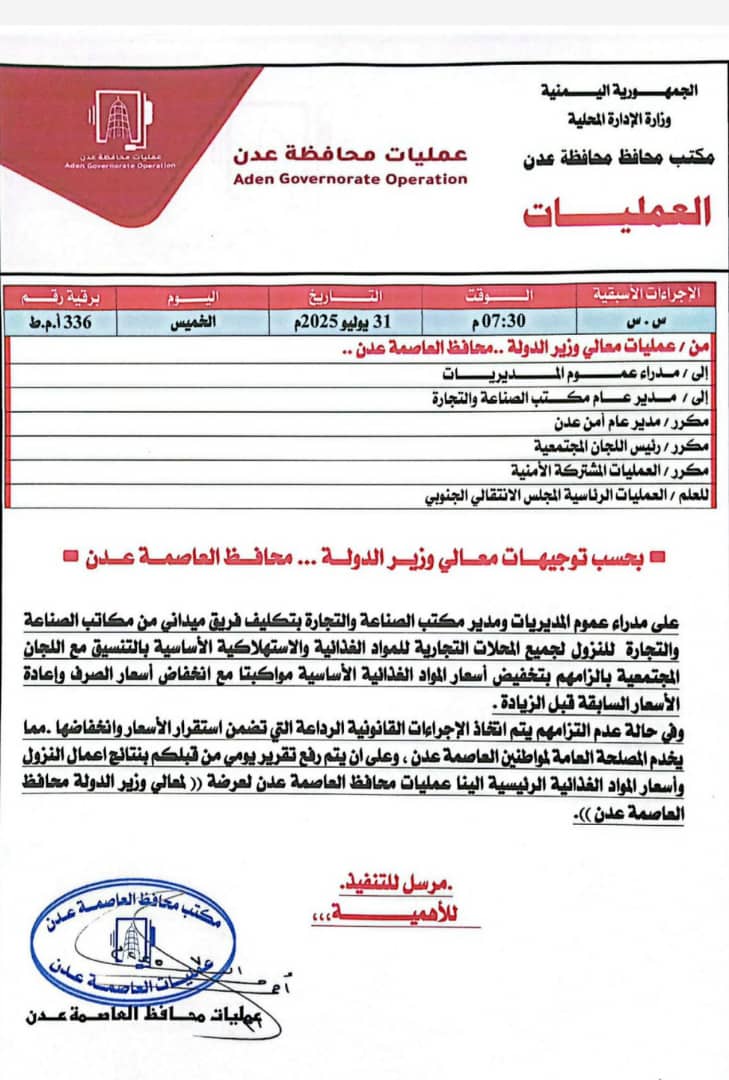 بتوجيهات مباشرة من معالي وزير الدولة، محافظ العاصمة عدن الأستاذ أحمد حامد لملس، أطلقت قيادة العاصمة عدن حملة رقابية مكثفة على الأسواق التجارية في مختلف المديريات، لضبط أسعار المواد الغذائية الأساسية وتخفيف أعباء المعيشة عن المواطنين، وذلك استجابة للتراجع الملحوظ في أسعار صرف العملات الأجنبية.