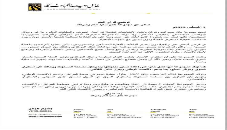 أصدرت مجموعة هائل سعيد أنعم وشركاه بيان للرأي تشير إلى أن أي تحريك في أسعار منتجاتها يتطلب التزام من الحكومة والبنك بتوفير العملة الصعبة.
