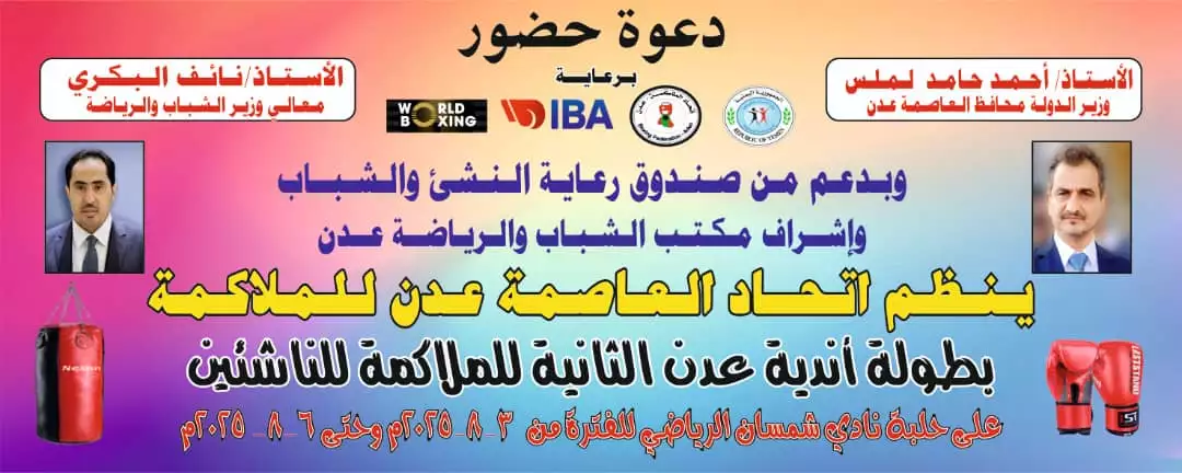 برعاية معالي وزير الدولة محافظ العاصمة عدن “الأستاذ أحمد حامد لملس”، ومعالي وزير الشباب والرياضة “الأستاذ نايف البكري”، وتنظيم “اتحاد العاصمة عدن للملاكمة”، تنطلق “بطولة أندية عدن الثانية للملاكمة للناشئين” خلال الفترة من “3 وحتى 6 أغسطس 2025م”.