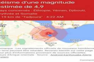 من جانب آخر أفاد المركز الأوروبي لرصد الزلازل، بأنه تم تسجيل زلزال بقوة 4.9 درجة قبالة سواحل القرن الإفريقي، وبالذات ساحل جيبوتي.