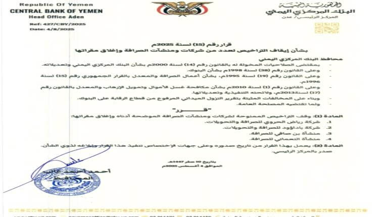 أصدر محافظ البنك المركزي أ. أحمد أحمد غالب قرار رقم (15) لعام 2025م، بشأن ايقاف التراخيص الممنوحة لعددٍ من شركات ومنشآت الصرافة المخالفة وإغلاق مقراتها، والمثبتة بتقرير النزول الميداني المرفوع من قطاع الرقابة على البنوك.