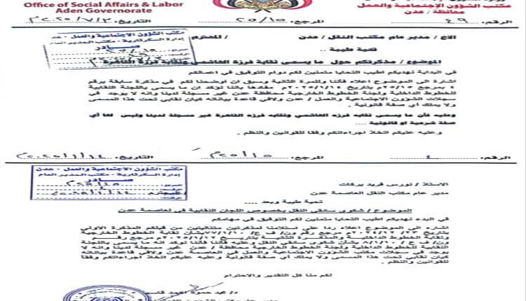 كشفت وثيقتان صادرتان عن مكتب الشؤون الاجتماعية والعمل بالعاصمة عدن، برقم (4) ورقم (49)، أن “اللجنة النقابية للخطوط الداخلية في العاصمة عدن” و”اللجنة النقابية للخطوط الخارجية في عدن” (للأجرة) لا تملكان أي صفة قانونية أو شرعية، وأنه لا يوجد في سجلات مكتب الشؤون الاجتماعية والعمل في العاصمة عدن ولا في قاعدة بياناته كيان نقابي بهذا المسمى، ولا يملك أي صفة قانونية.