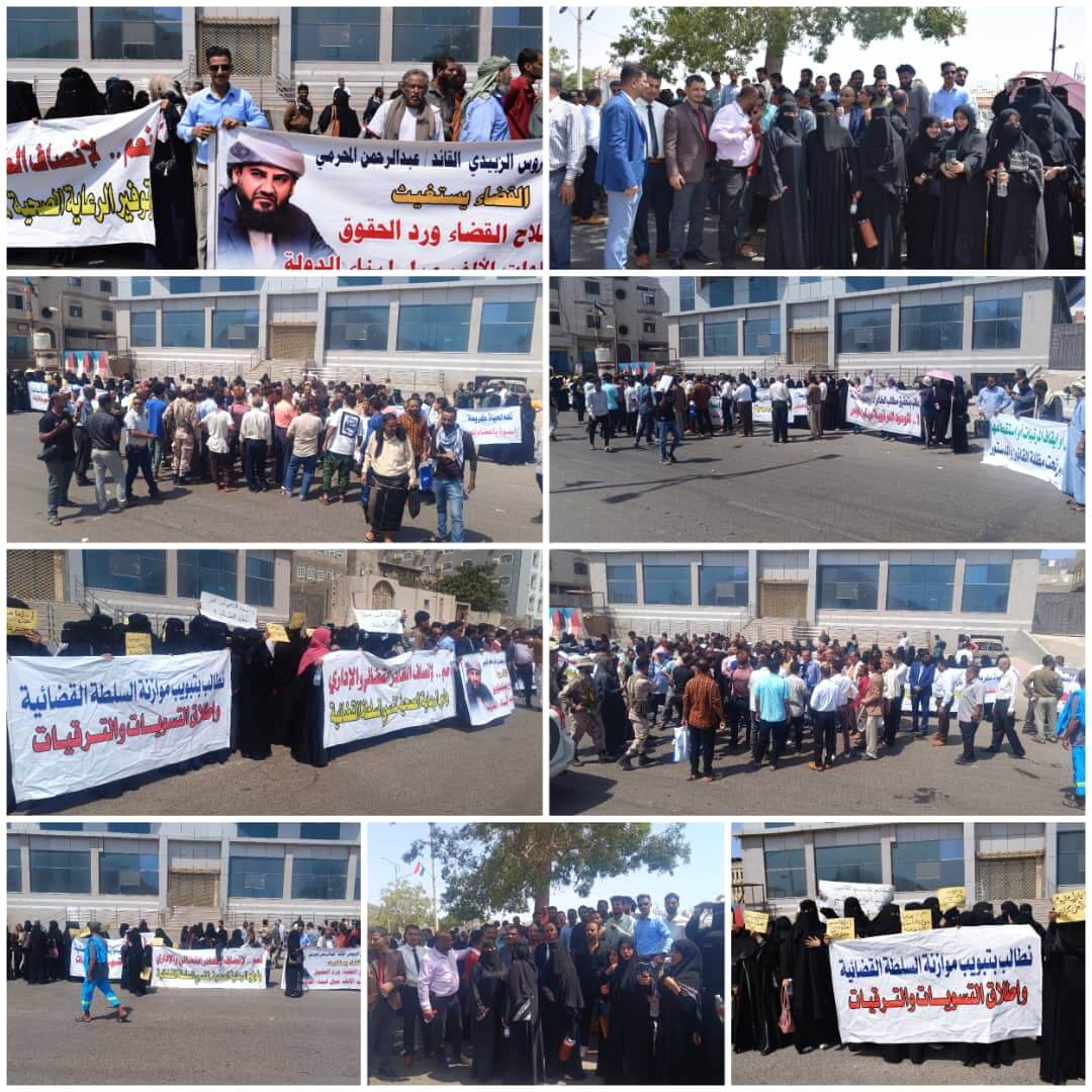 نظم منتسبو السلطة القضائية ( قضاة وإداريون ) وقفة احتجاجية سلمية ،أمام بوابة قصر المعاشيق بالعاصمة عدن ،لمطالبة مجلس القيادة الرئاسي والحكومة باعتمادوتوفير الموازنة الكافية لقيام السلطة القضائية ومنتسبيها بأداء المهام المناطة بهم بكفاءة وفاعلية وحياد طبقا للدستور والقانون والمواثيق الدولية .