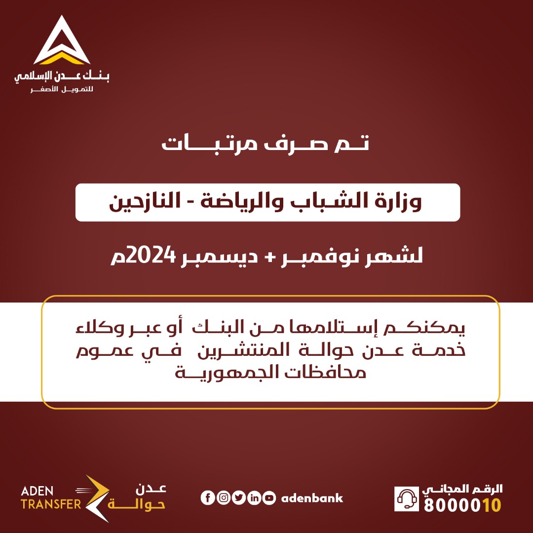 أعلن بنك عدن الإسلامي للتمويل الأصغر اليوم الأحد ، عن بدء صرف مرتبات وزارة الشباب والرياضة – النازحين لشهر نوفمبر و ديسمبر للعام 2024م