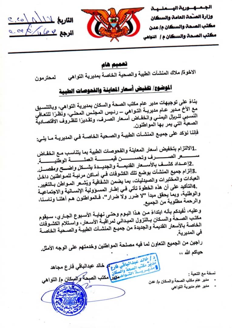 بناءً على توجيهات مدير عام مكتب الصحة والسكان بمديرية التواهي، وبالتنسيق مع الأخ مدير عام مديرية التواهي – رئيس المجلس المحلي، ونظرًا للتعافي النسبي للريال اليمني وانخفاض أسعار الصرف، وتقديرًا للظروف الاقتصادية الصعبة التي يمر بها المواطنون؛