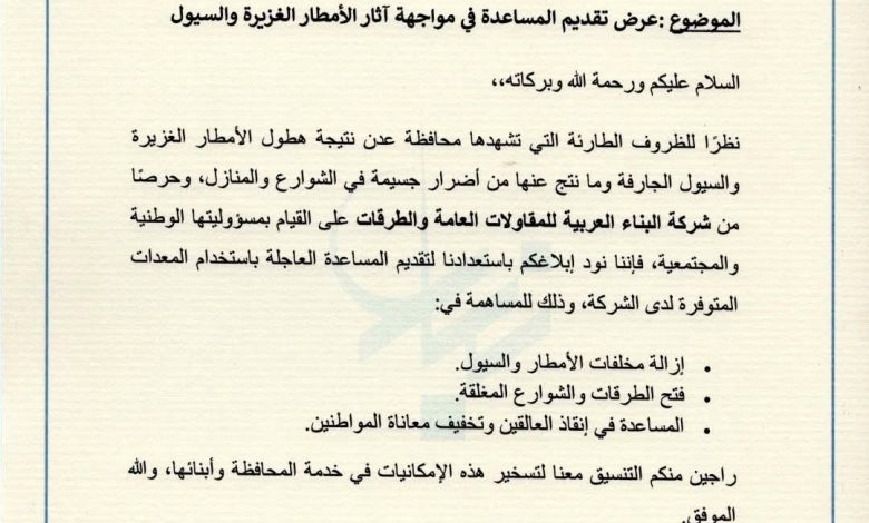 أعلنت شركة البناء العربية للمقاولات والخدمات استعدادها لتقديم الدعم العاجل في مواجهة الأضرار التي خلفتها الأمطار الغزيرة والسيول التي ضربت العاصمة عدن خلال الأيام الماضية.