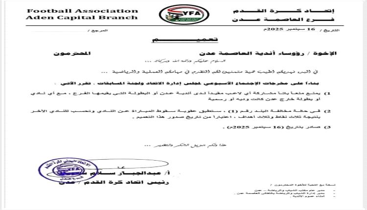 أصدر فرع الاتحاد العام لكرة القدم في العاصمة عدن، قراراً يقضي بمنع اللاعبين المقيدين ضمن أندية دوري عدن الممتاز من المشاركة في أي بطولات خارج نطاق المحافظة، وذلك في إطار الحفاظ على حقوق الأندية العدنية وتعزيز مكانتها التنظيمية والفنية.