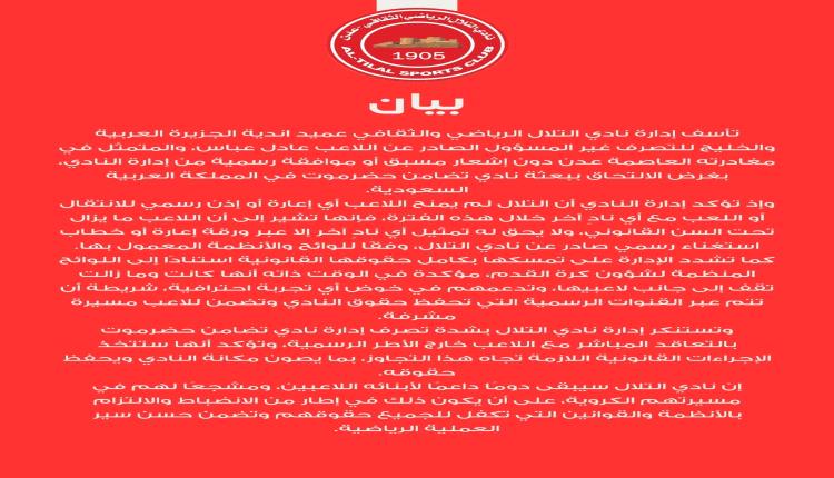 تأسف إدارة نادي التلال الرياضي والثقافي عميد اندية الجزيرة العربية والخليج للتصرف غير المسؤول الصادر عن اللاعب عادل عباس، والمتمثل في مغادرته العاصمة عدن دون إشعار مسبق أو موافقة رسمية من إدارة النادي، بغرض الالتحاق ببعثة نادي تضامن حضرموت في المملكة العربية السعودية.