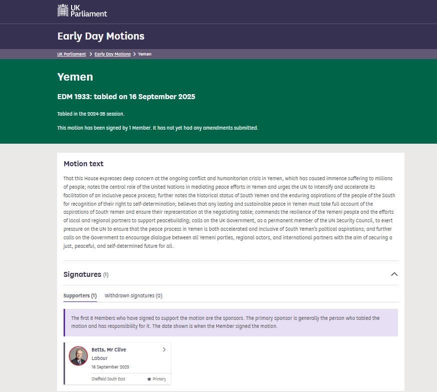 أعرب مجلس البرلمان البريطاني، في مذكرة مبكرة قُدمت بتاريخ 16 سبتمبر 2025 خلال الدورة البرلمانية (2024 – 2026)، عن بالغ قلقه إزاء الصراع المستمر والأزمة الإنسانية المتفاقمة في اليمن، والتي تسببت في معاناة كبيرة لملايين المواطنين.