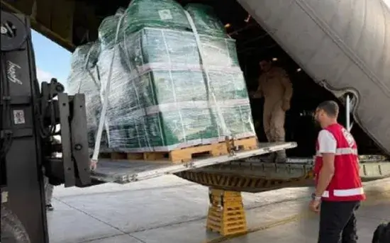 وتحمل الطائرة الإغاثية، على متنها سلالًا غذائية وحقائب إيوائية، تمهيدًا لنقلها إلى المتضررين من الشعب الفلسطيني الشقيق داخل قطاع غزة.