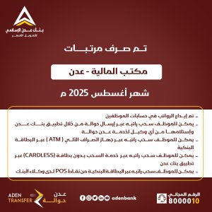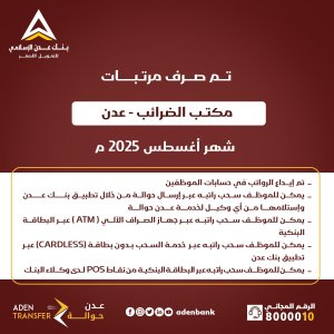 أعلن بنك عدن الإسلامي للتمويل الاصغر اليوم عن بدء عملية صرف مرتبات مكتب الضرائب – عدن – لشهر أغسطس 2025 م.