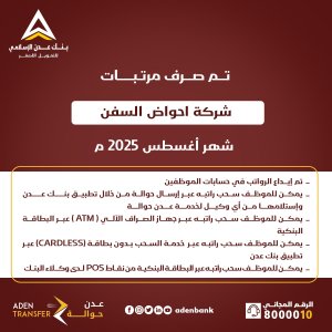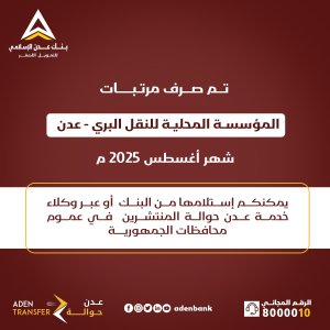 أعلن بنك عدن الإسلامي للتمويل الاصغر اليوم عن بدء عملية صرف مرتبات المؤسسة المحلية للنقل البري – عدن – لشهر أغسطس 2025م.