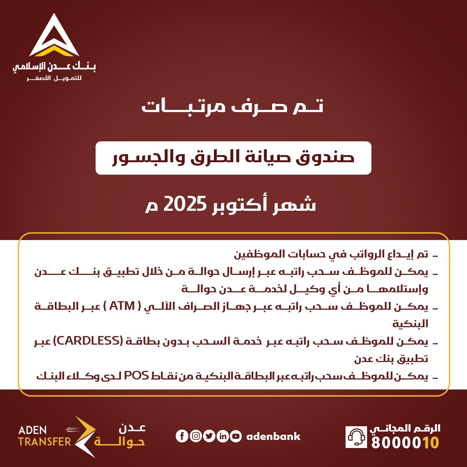 أعلن بنك عدن الإسلامي للتمويل الأصغر اليوم الخميس ، عن بدء صرف مرتبات صندوق صيانة الطرق والجسور لشهر أكتوبر لعام 2025م